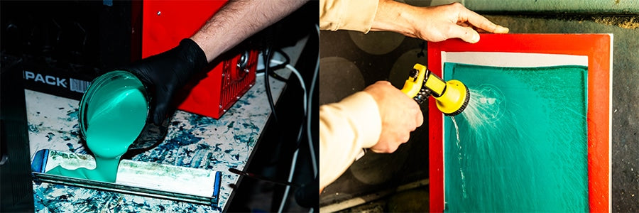 Siebdruck - ein aufwendiger Prozess für das perfekte DruckergebnisDoch bevor der Druck starten kann, braucht es erstmal ein Sieb mit dem entsprechenden Motiv. Ich muss also zunächst die Emulsion auf das Sieb auftragen, die Belichtung durchführen und das Sieb auswaschen. Et Voila, das Sieb is fertig für den Einsatz.